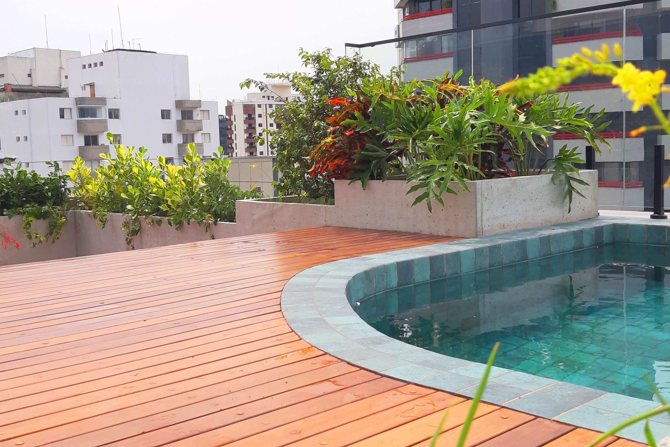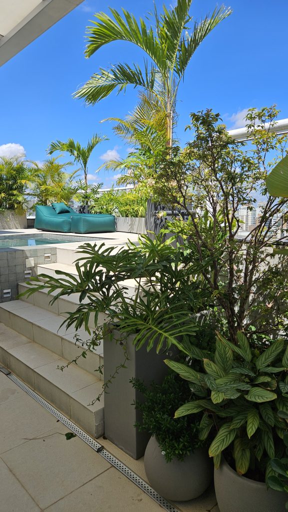 Quando crio um projeto para essas áreas, avalio todas as características do local e qual a melhor maneira de transformar o concreto em jardim, trazendo vida e movimento.